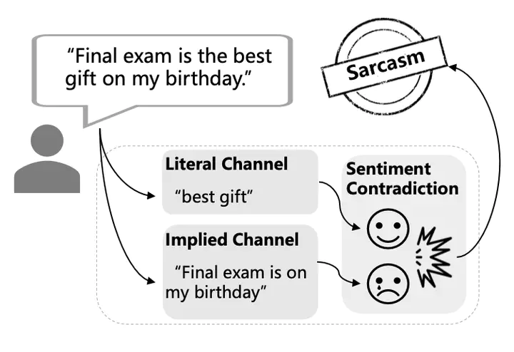 Sarcasm employs ambivalence, where one says something positive but actually means negative, and vice versa. The essence of sarcasm, which is also a sufficient and necessary condition, is the conflict between literal and implied sentiments expressed in one sentence. However, it is difficult to recognize such sentiment conflict because the sentiments are mixed or even implicit. As a result, the recognition of sophisticated and obscure sentiment brings in a great challenge to sarcasm detection. In this paper, we propose a Dual-Channel Framework by modeling both literal and implied sentiments separately. Based on this dual-channel framework, we design the Dual-Channel Network (DC-Net) to recognize sentiment conflict. Experiments on political debates (i.e. IAC-V1 and IAC-V2) and Twitter datasets show that our proposed DC-Net achieves state-of-the-art performance on sarcasm recognition. Our code is released to support research.